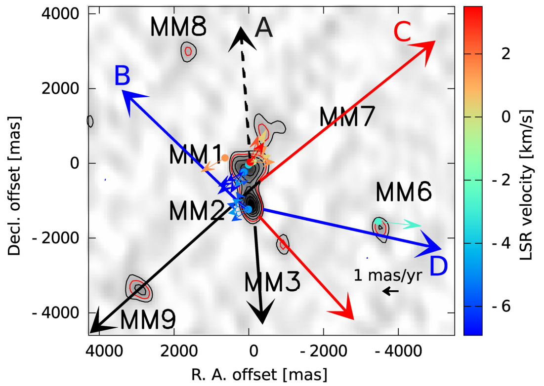 We focused our study on AFGL 5142-MM1, a high-mass protostar with a mass of \(6.5~\mathrm{M}_{\odot}\) known for its distinct outflow features (Burns et al., 2017). We combined seven epochs of archival data from the VERA (VLBI Exploration of Radio Astrometry) array (collected between 2014 and 2015) with new, high-sensitivity observations from the KaVA (KVN and VERA Array) network conducted in 2016 (Rosli et al., 2023). By tracking specific maser features over several years, we measured their positions and compared their motions to the expected trajectories of the bow shock surfaces.