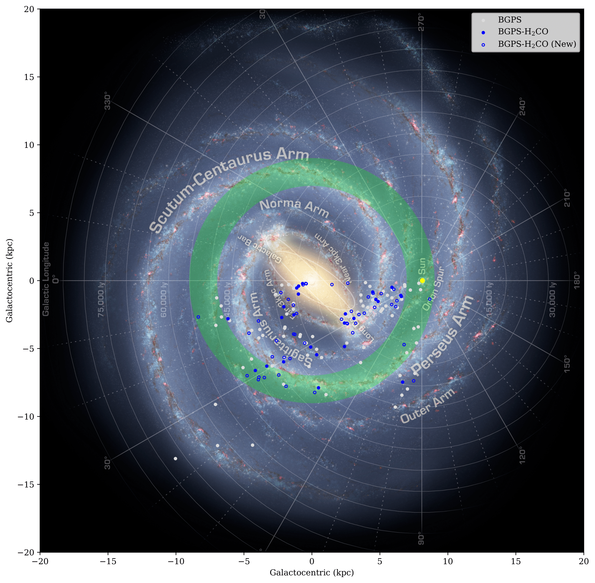 Face-on view of the Milky Way showing locations of H2CO detections in BGPS molecular clouds, with the green annulus marking the traditional GHZ definition